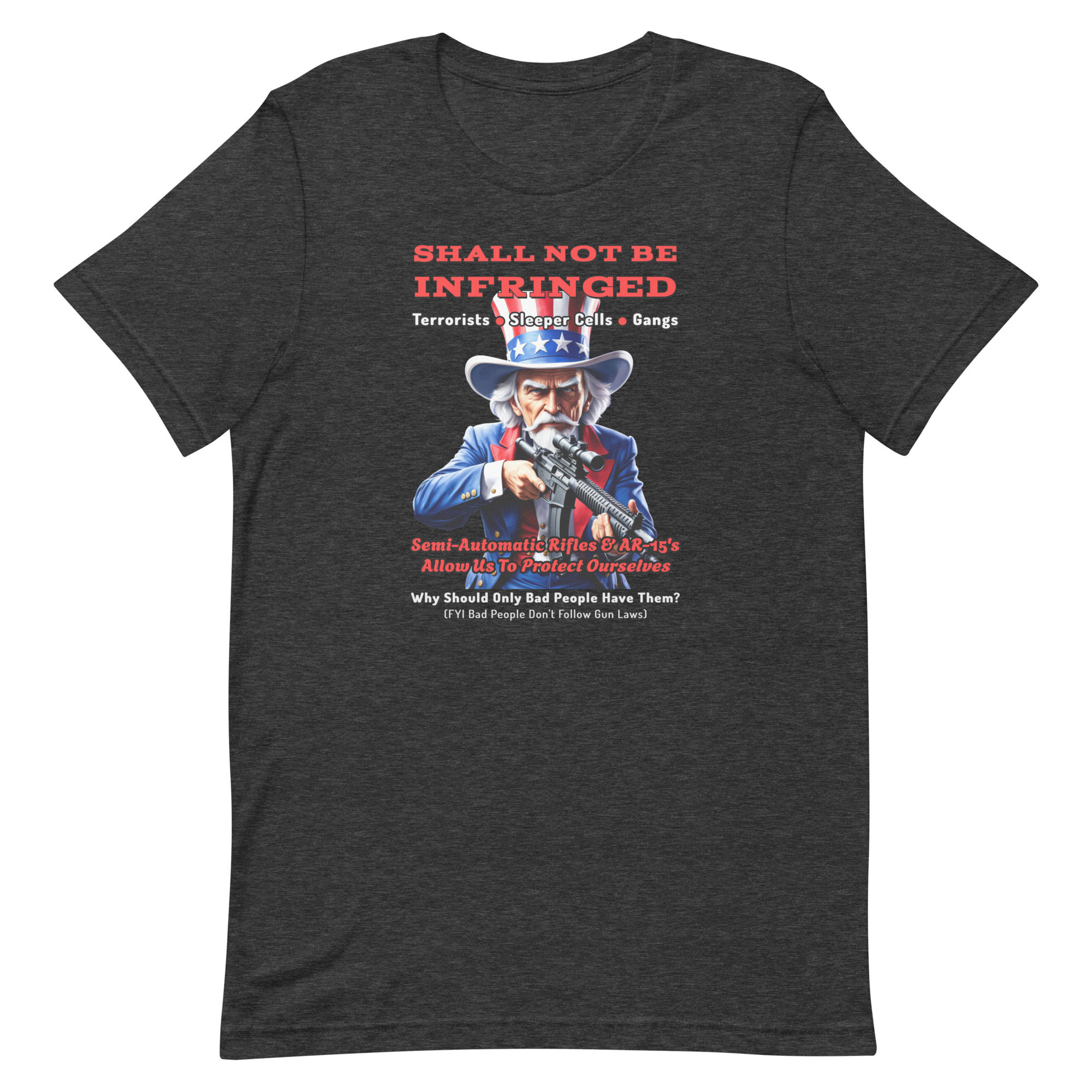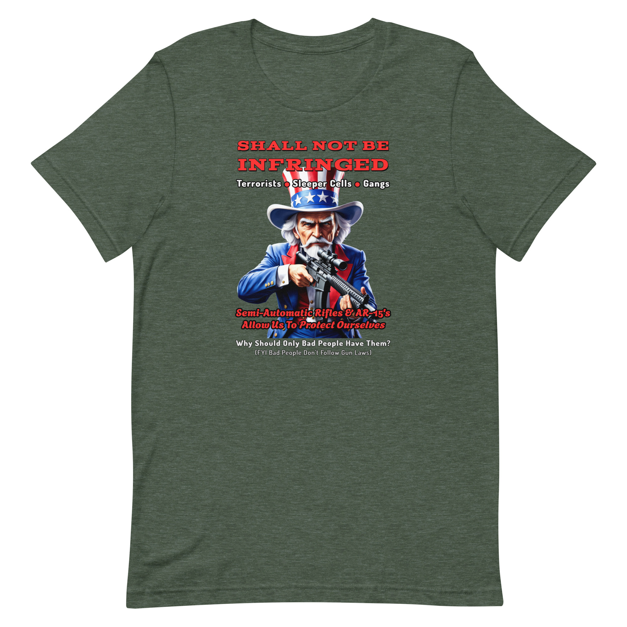 This design features Uncle Sam standing as a symbol of American independence and determination, paired with a strong message about the right of law-abiding citizens to defend themselves in a country that still contains real threats.