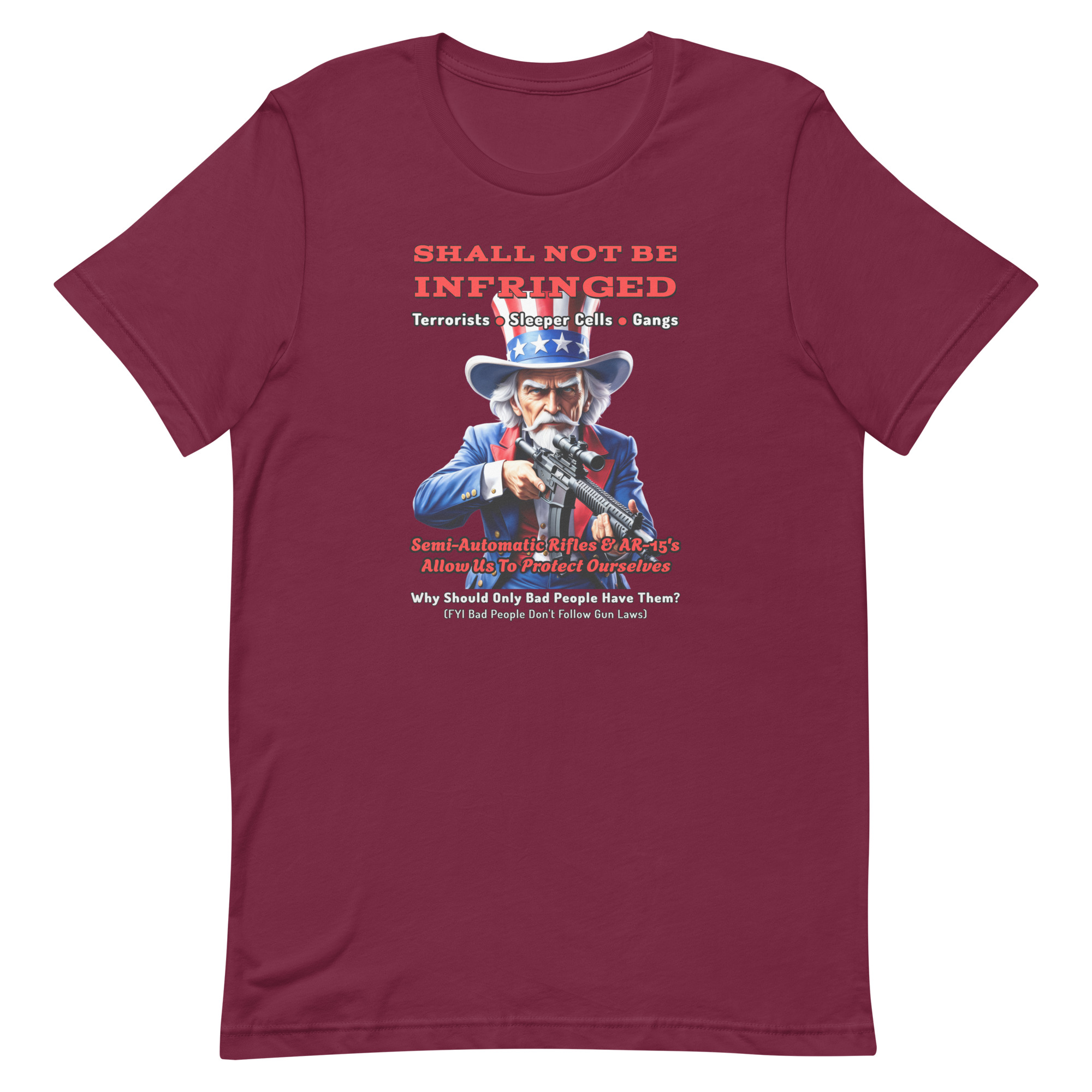 The Second Amendment affirms the right of citizens to defend themselves and their families. This bold design featuring Uncle Sam and the phrase “Shall Not Be Infringed” reflects the enduring belief that freedom includes the right to protect what matters most.