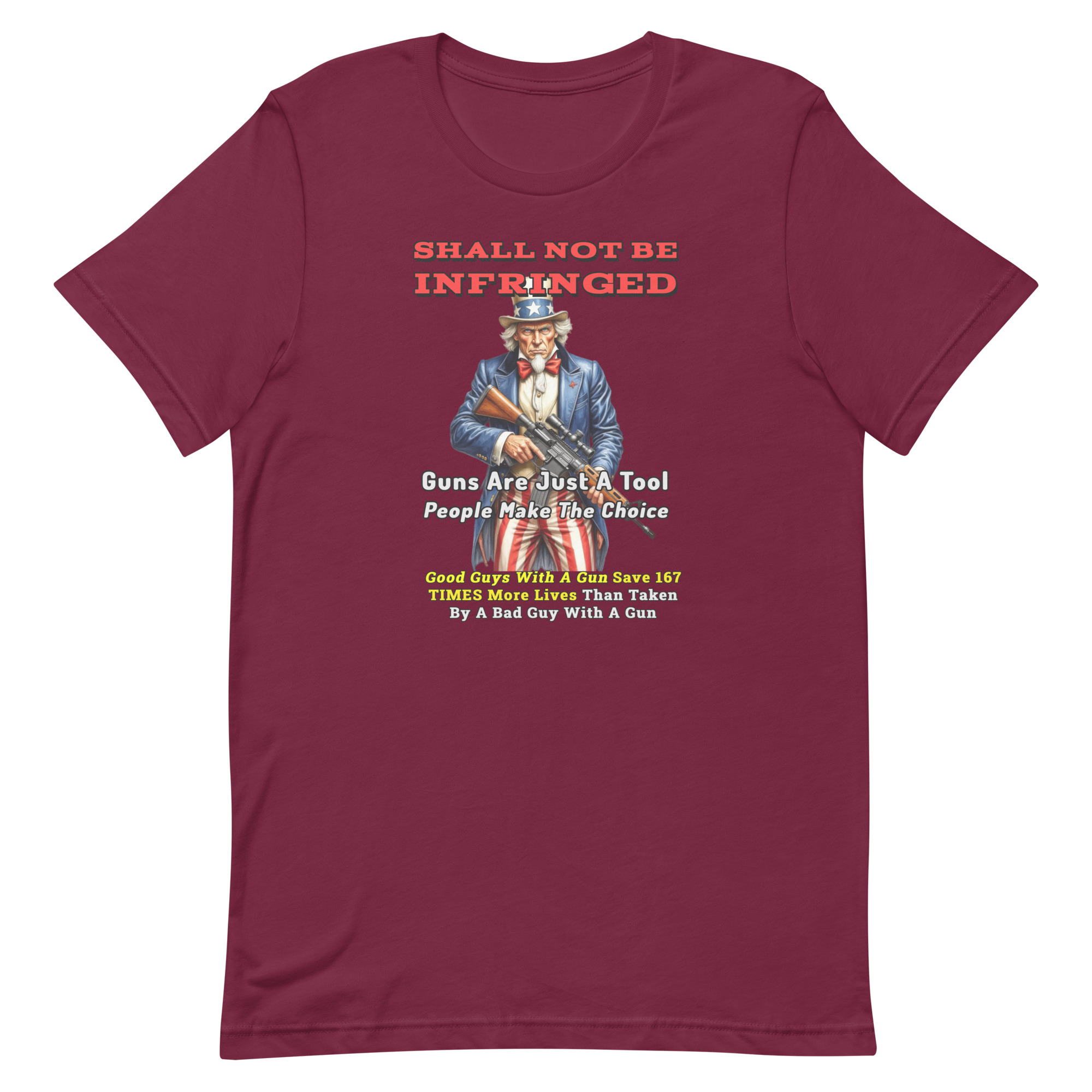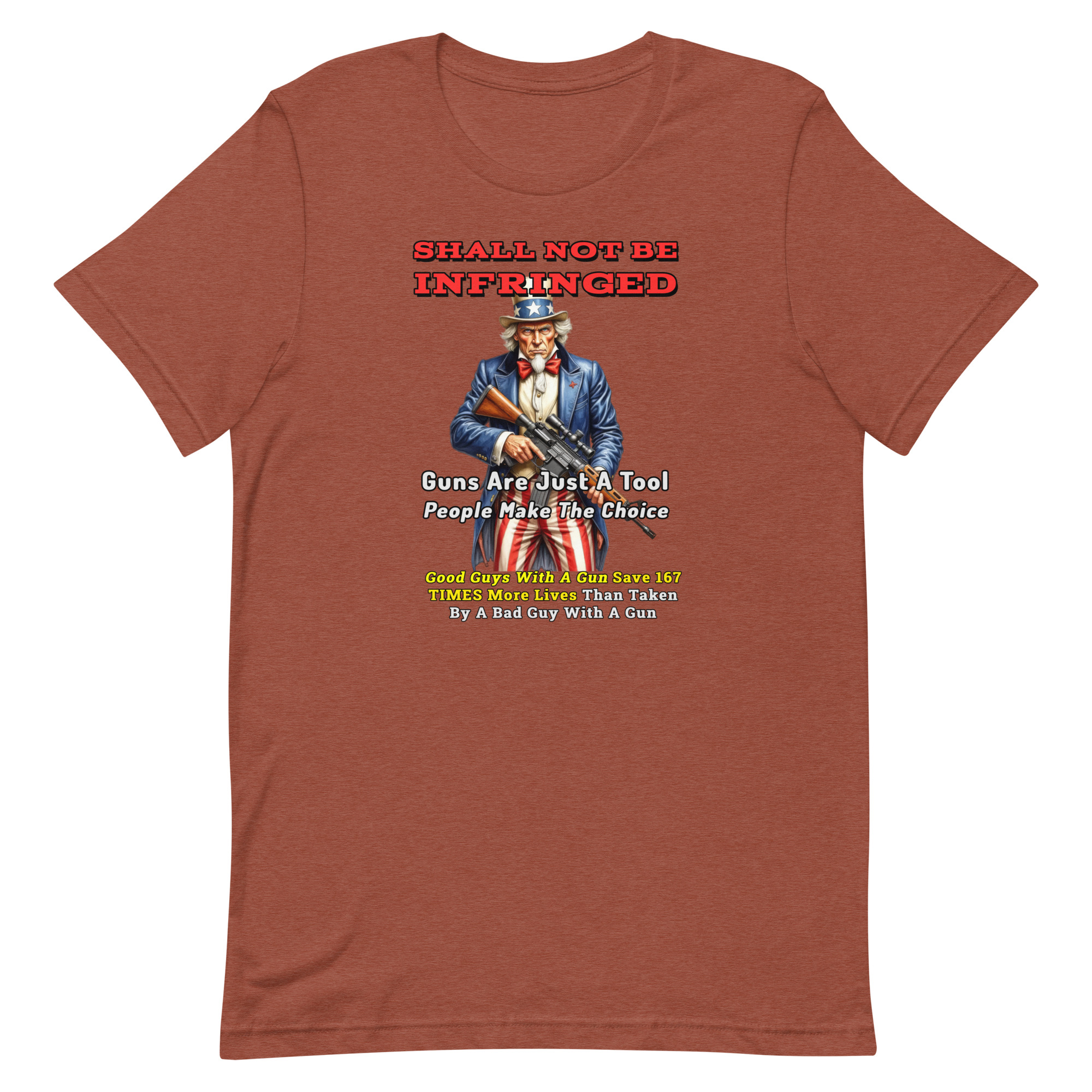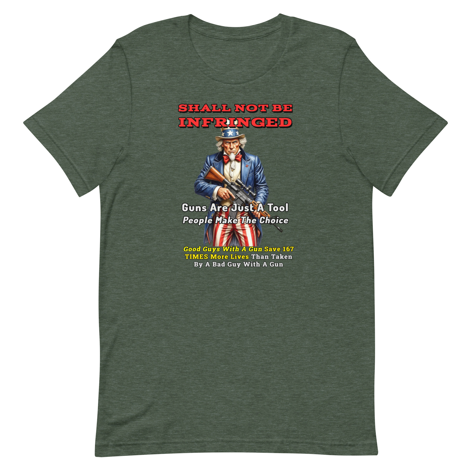Featuring Uncle Sam and the powerful phrase “Shall Not Be Infringed,” this design reflects a belief shared by many Americans: tools themselves aren’t responsible for how they’re used— responsibility ultimately lies with the people who use them.