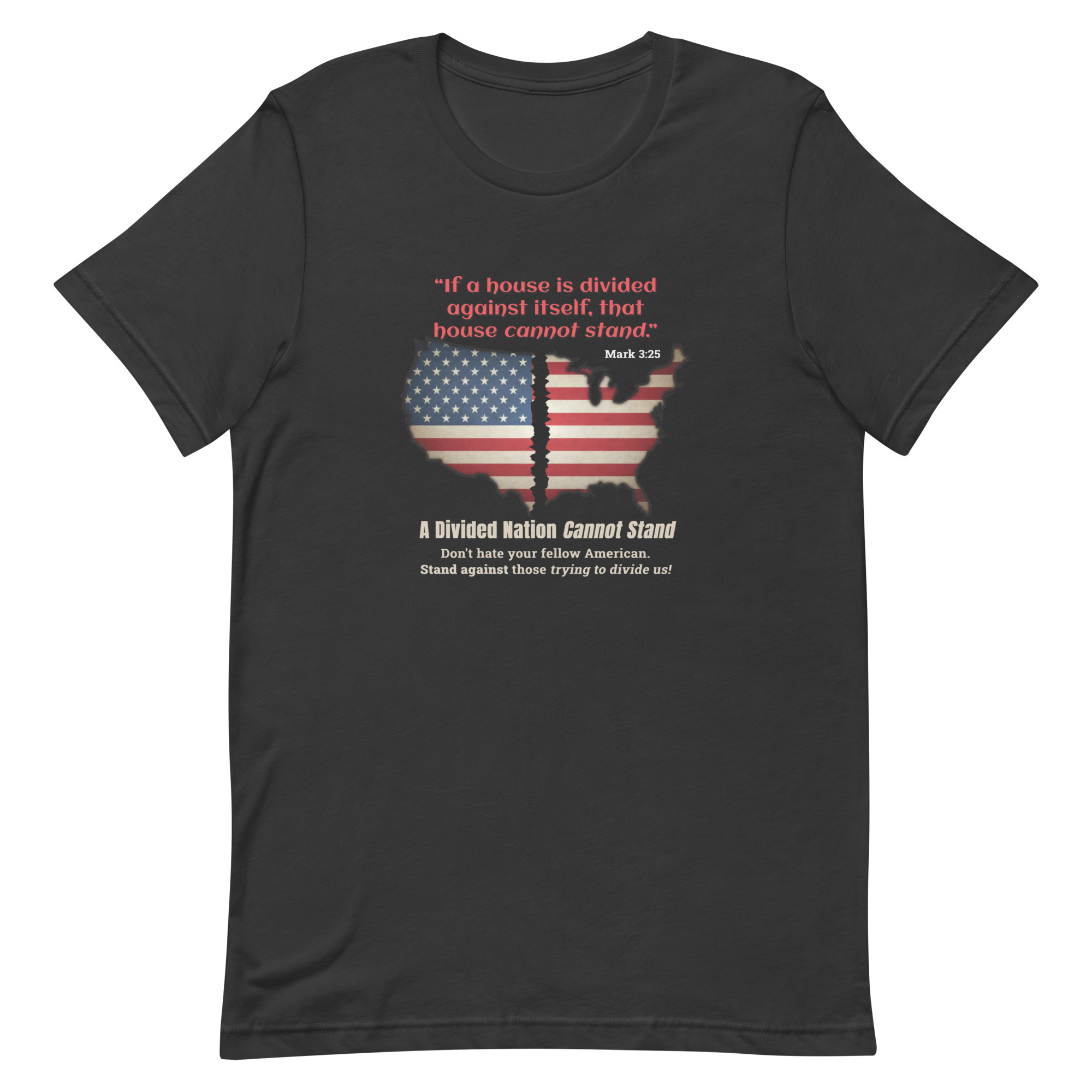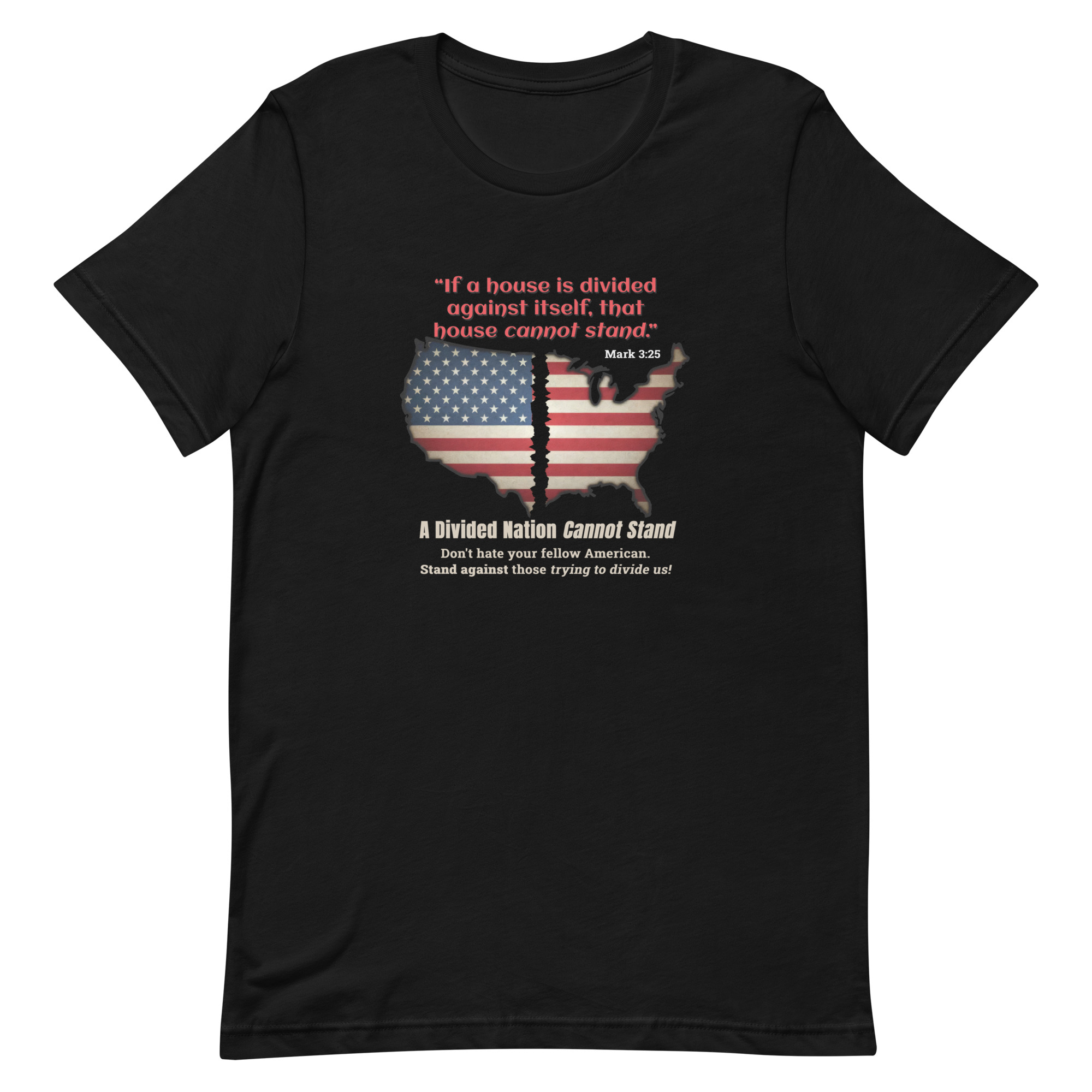 Inspired by Mark 3:25, this bold design features a divided American flag map and a powerful reminder that unity is essential. A call to stand together and reject division.