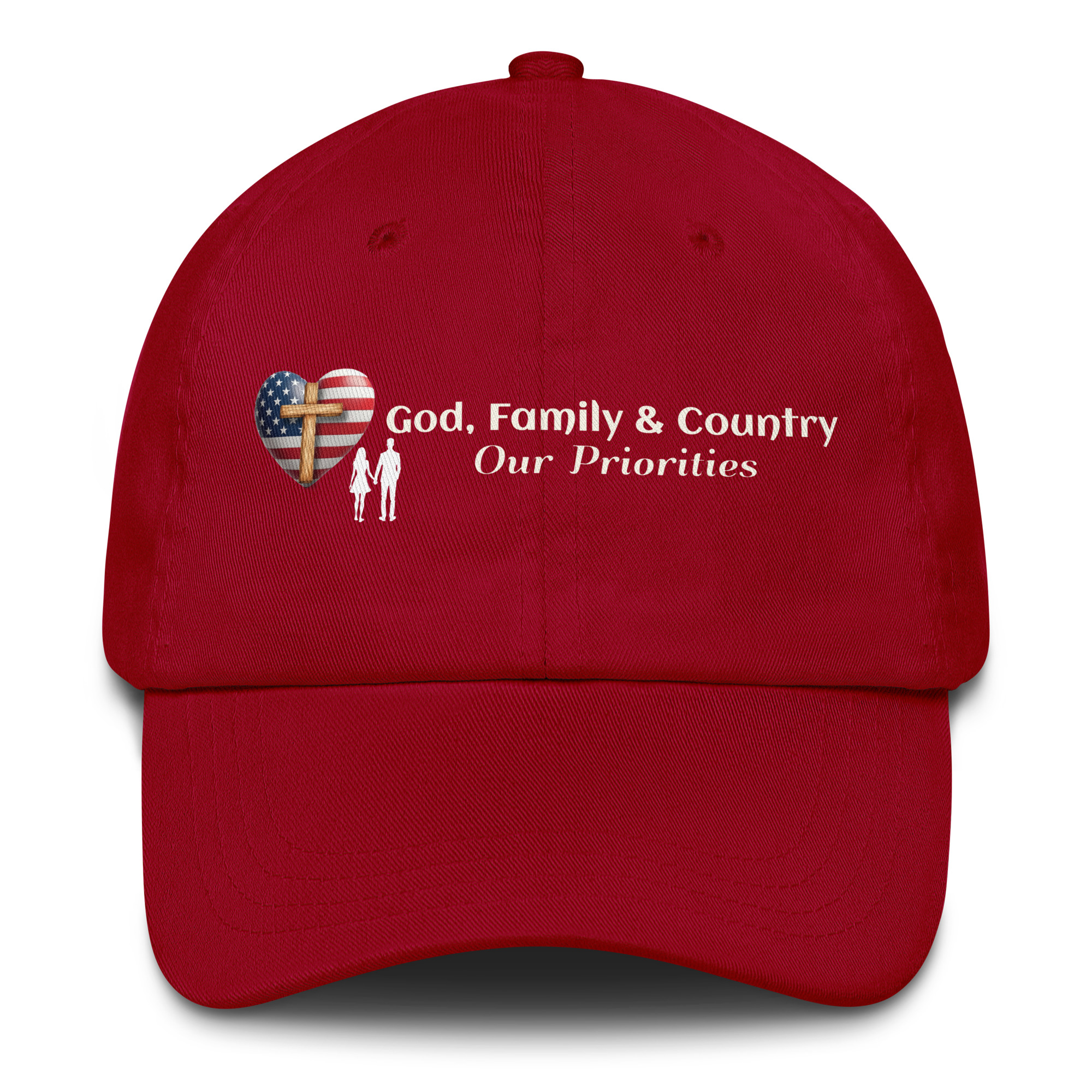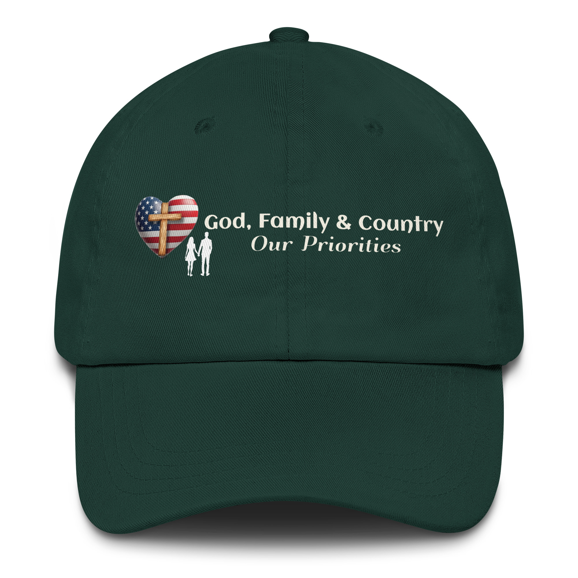 Faith first. Family always. Country honored. This clean, everyday baseball cap keeps your values front and center in a timeless, wearable design.