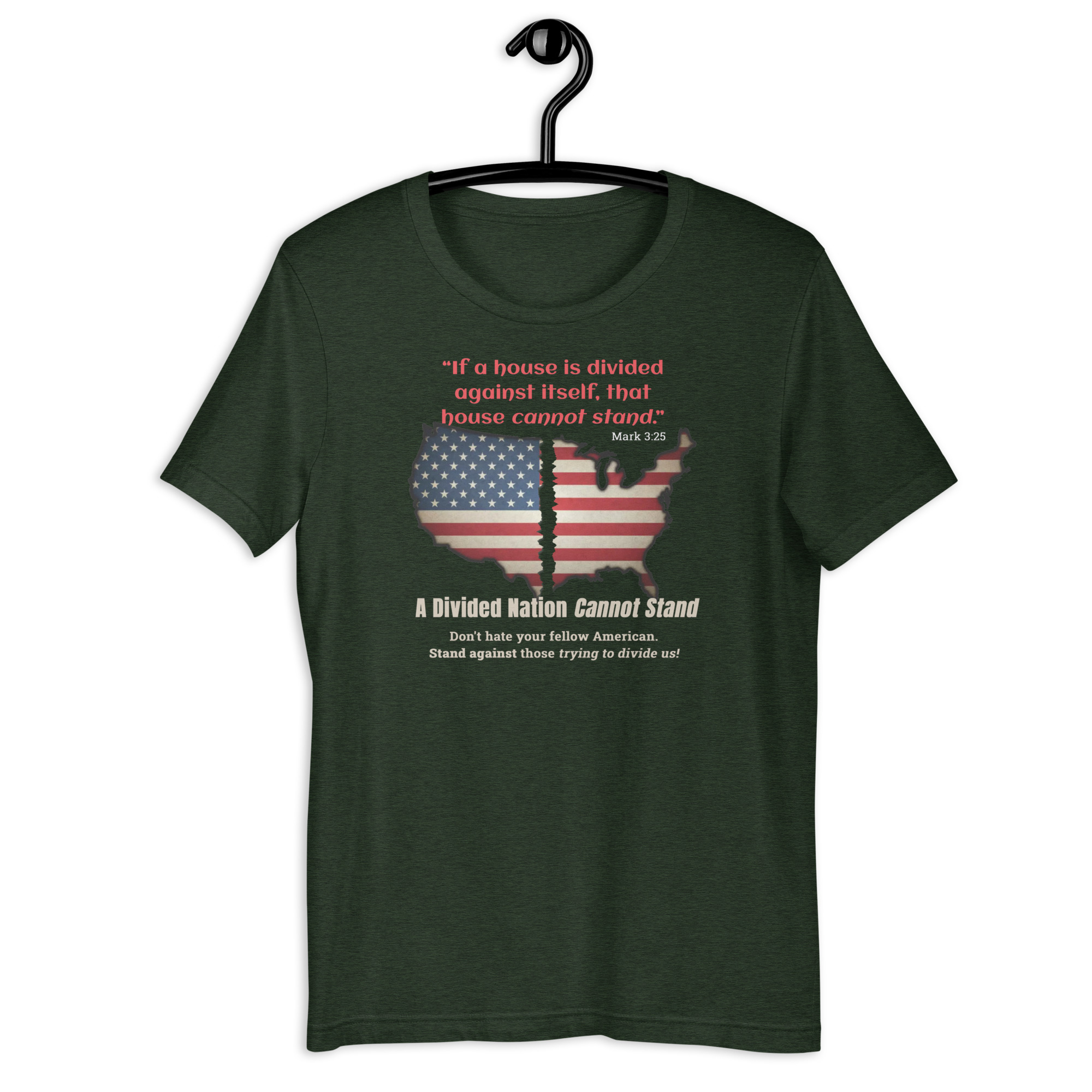 Inspired by Mark 3:25, this bold design features a divided American flag map and a powerful reminder that unity is essential. A call to stand together and reject division.
