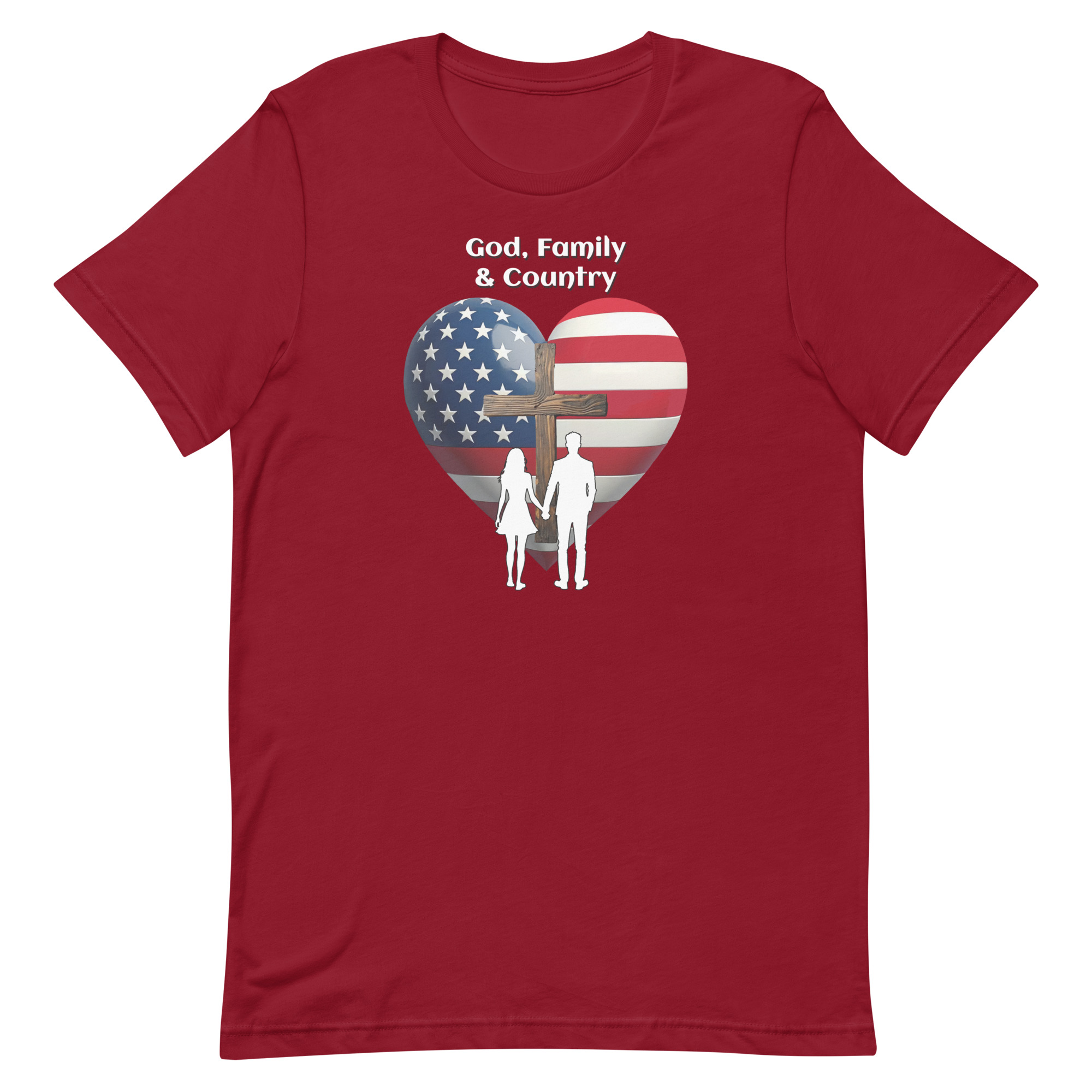 This powerful design brings those priorities to life — a heart wrapped in the American flag, a cross at its center, and a couple standing hand in hand.
