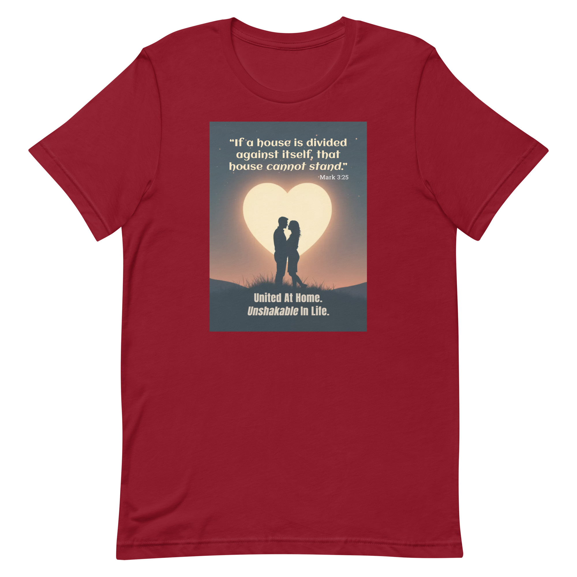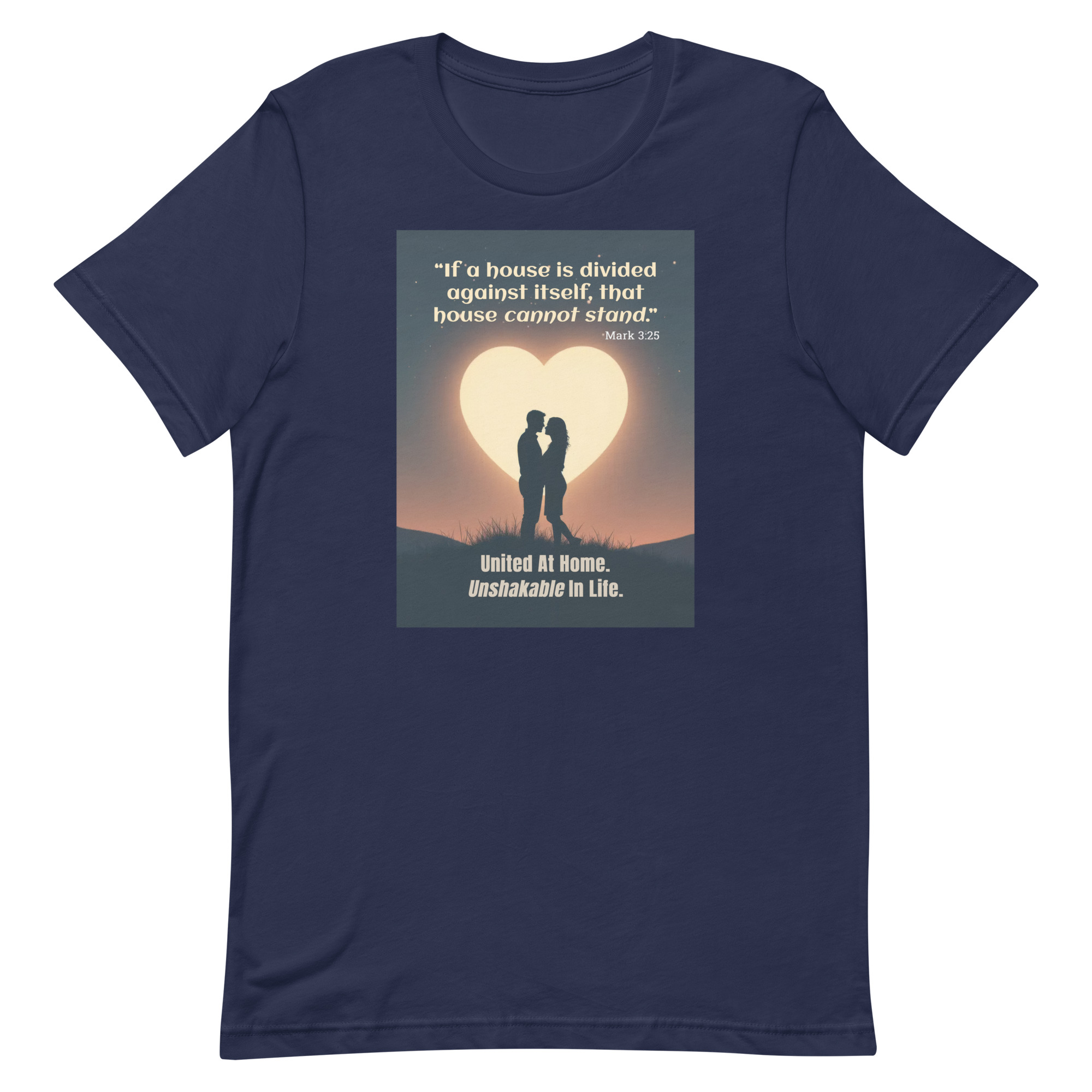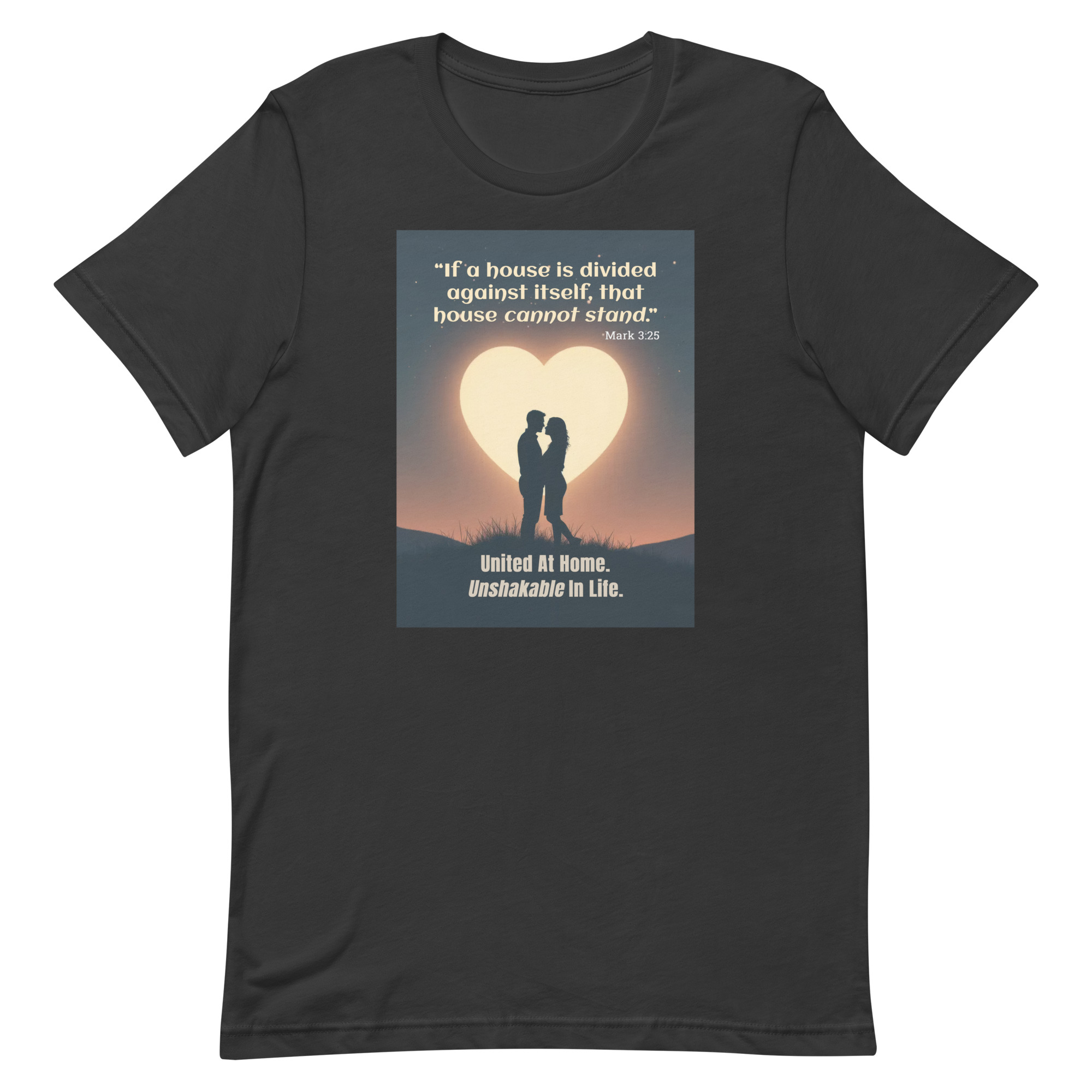 Rooted in Mark 3:25, this romantic design features a couple embracing beneath a glowing heart-shaped moon — a powerful reminder that unity at home creates strength in life.