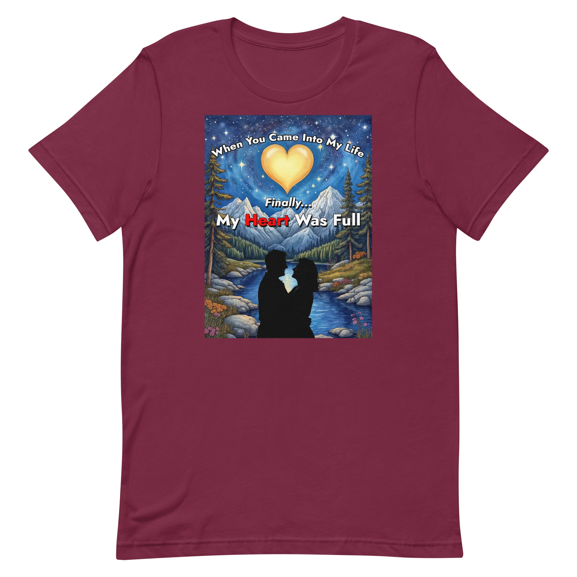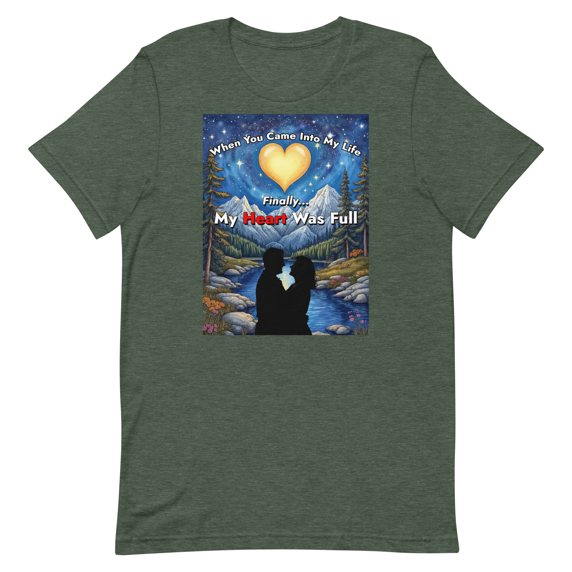This beautiful design captures that feeling through a magical forest scene with a glowing heart-shaped moon reflected in a peaceful river.
