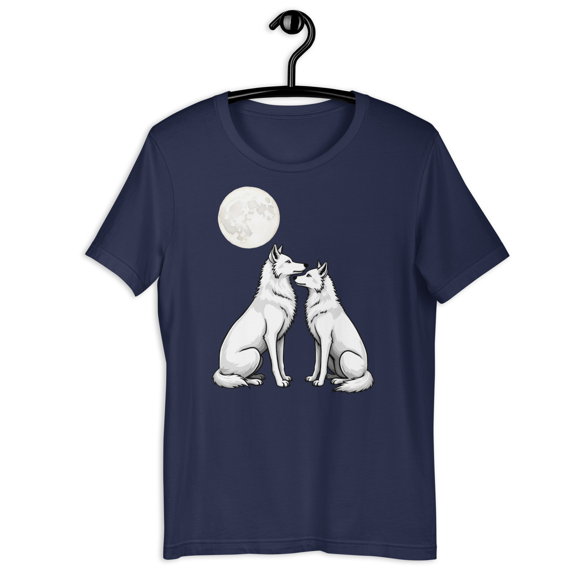 This design features two solid white wolves sitting face to face beneath a glowing full moon. No background distractions. No extra detail.