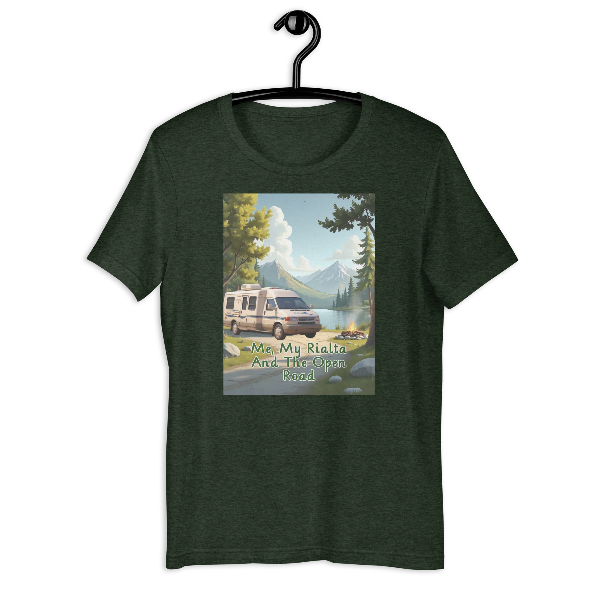 This design captures that perfect moment — a Rialta parked beside a campfire, surrounded by towering trees, mountain views, and the calm reflection of a quiet lake.