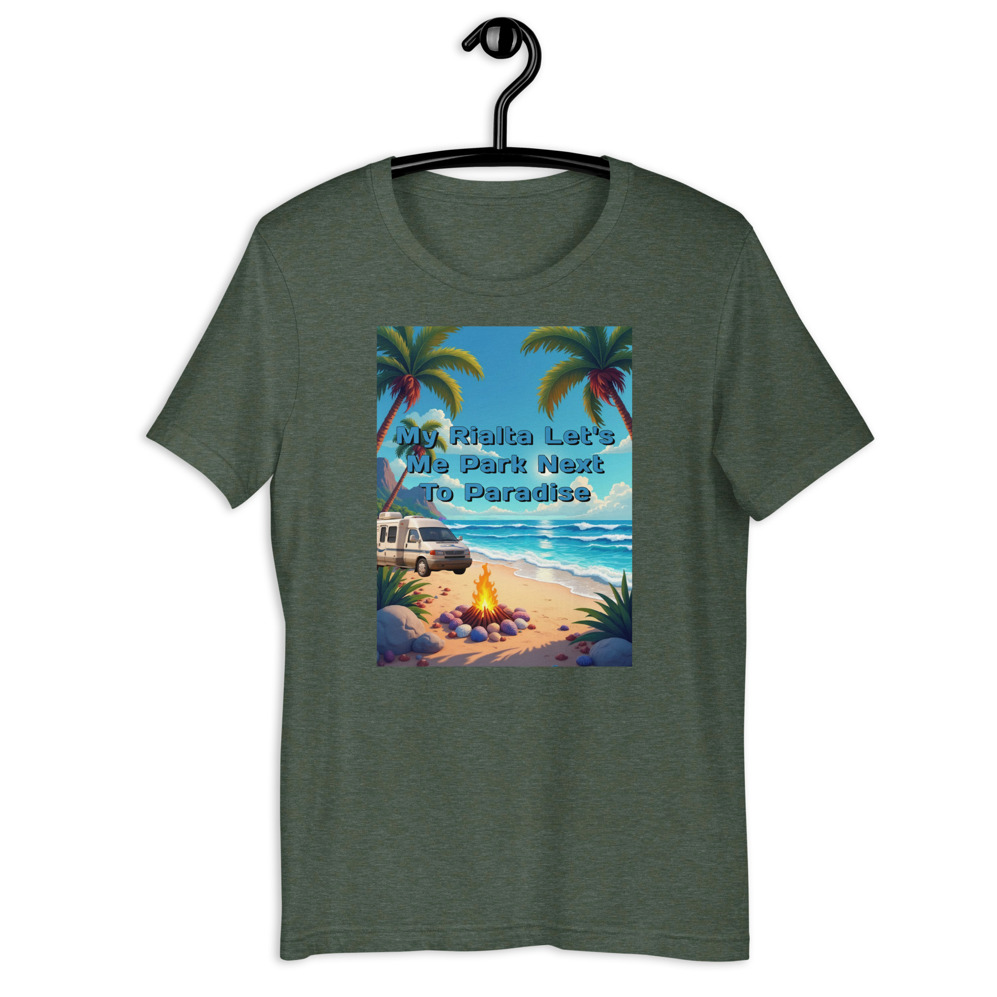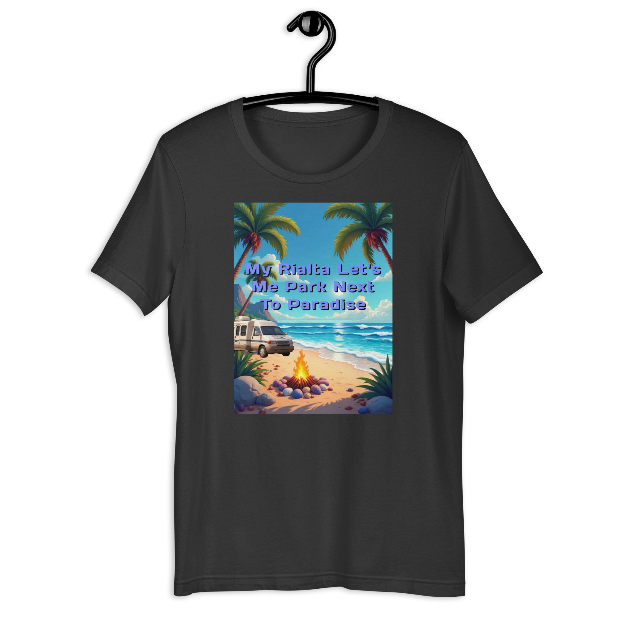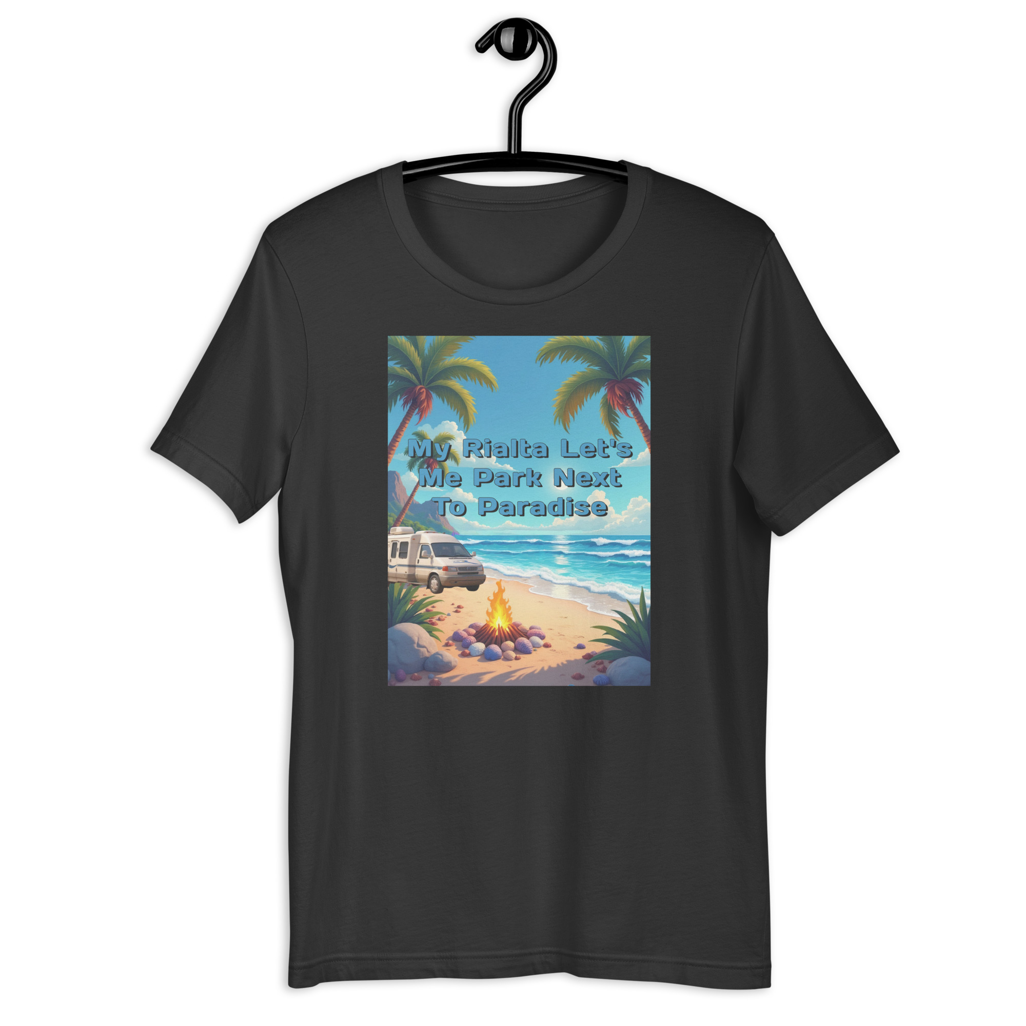 This design captures the perfect coastal moment — palm trees swaying in the breeze, the ocean stretching toward the horizon, and a Rialta parked beside a glowing campfire.